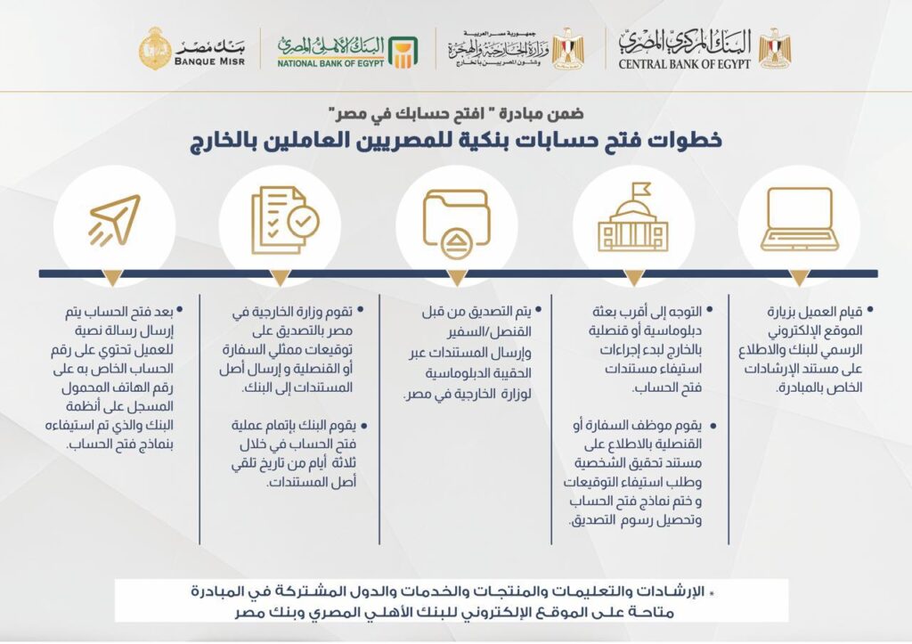 وتتيح المبادرة للمصريين بالخارج إمكانية فتح حسابات بنكية بسهولة عبر زيارة السفارات أو القنصليات المصرية، باستخدام بطاقة الرقم القومي أو جواز السفر الساري فقط، دون الحاجة إلى التواجد داخل مصر.
