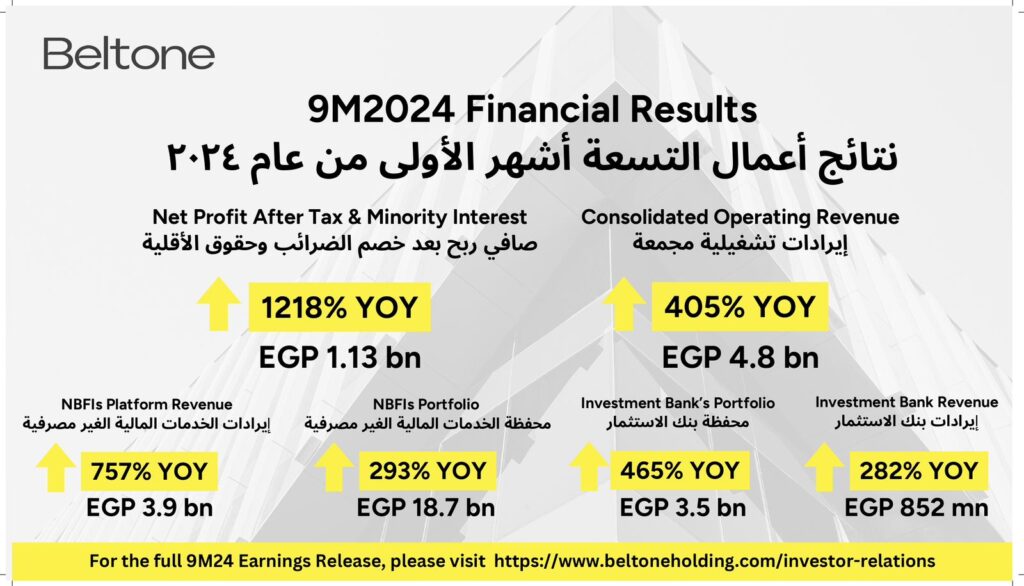 وعلى جانب آخر، استمرت منصة بنك الاستثمار في تحقيق نمو قوي لإيرادات التشغيل بمعدل سنوي 282% لتسجل 852 مليون جنيه خلال أول تسعة أشهر من عام 2024، وتعكس تلك النتائج التوسع الملحوظ في أنشطة الوساطة في الأوراق المالية، وتقديم باقة خدمات استشارية متنوعة، وارتفاع أتعاب الإدارة والأداء الخاصة بصناديق الاستثمار. كما ارتفع حجم محفظة بنك الاستثمار الغير المصرفية إلى 3.5 مليار جنيه، بارتفاع بلغ 465% عن العام السابق.